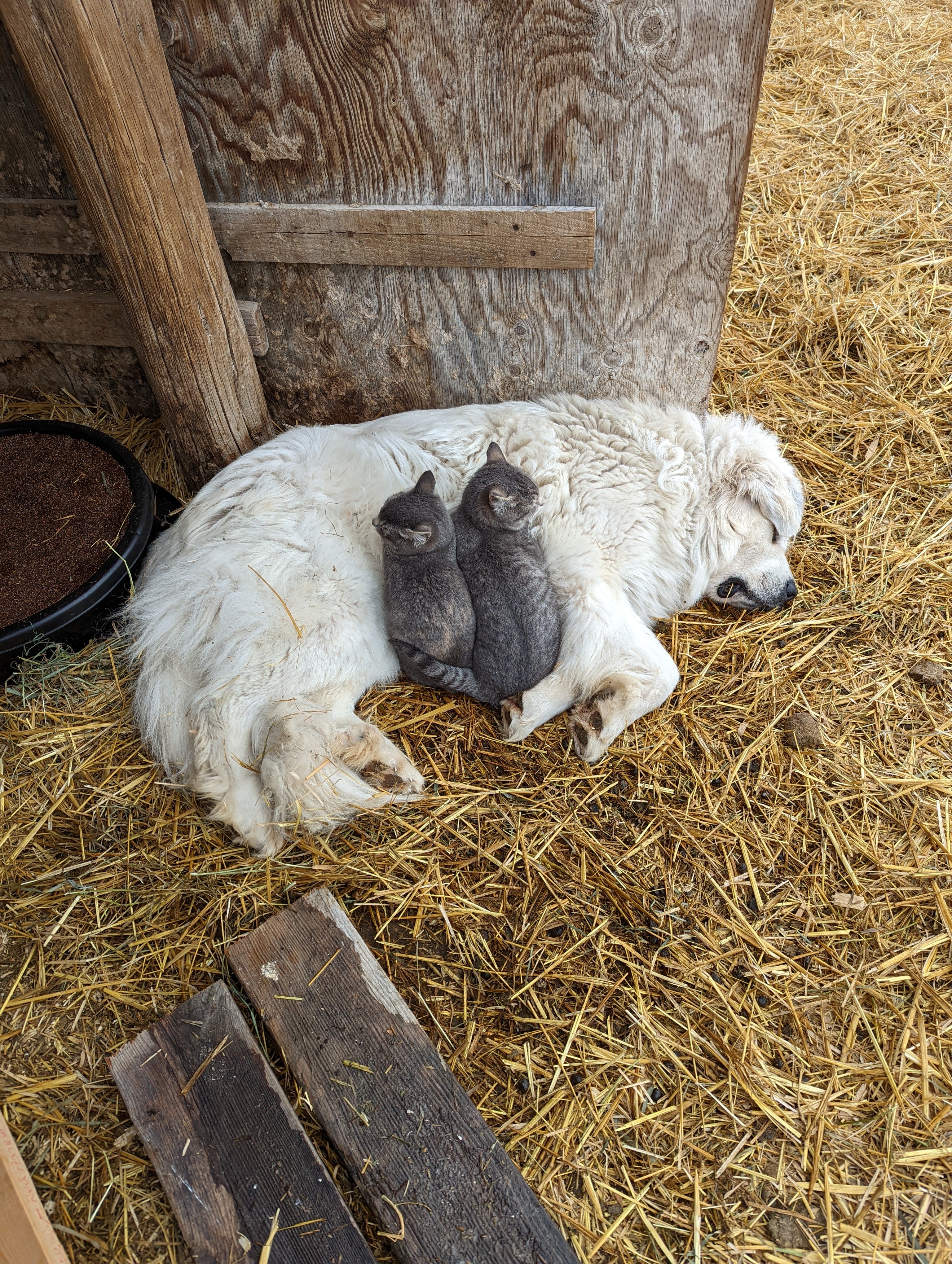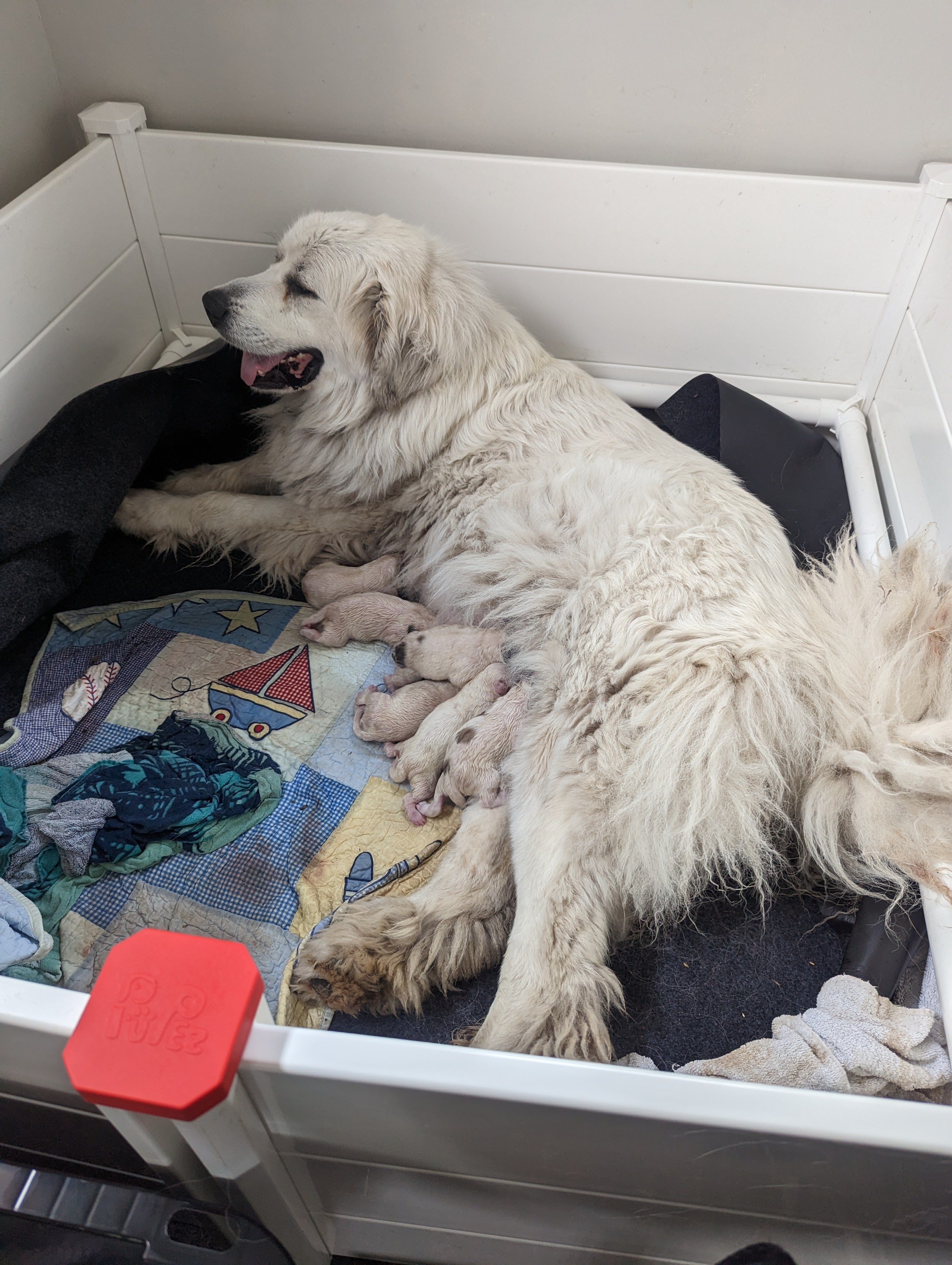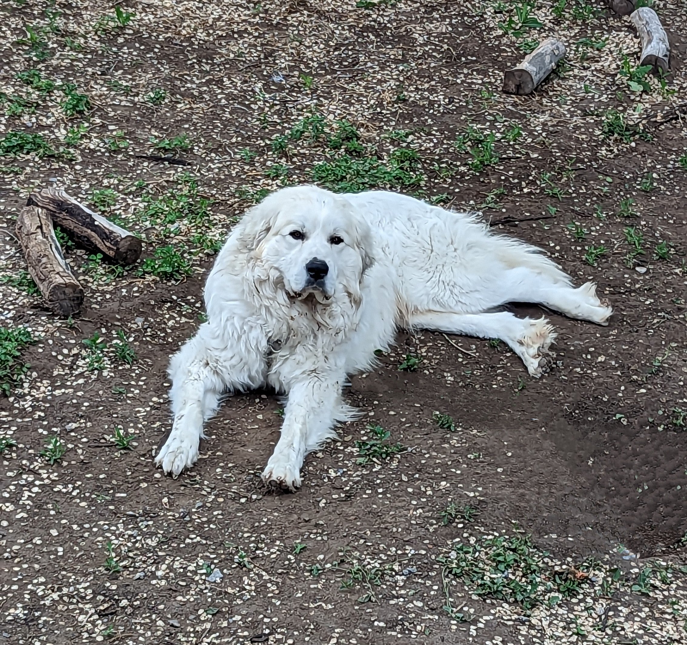 Parents are currently working as livestock guardian dogs protecting the sheep and poultry on our 80 acre farm. These Pyrenees are our farm and family guardians.